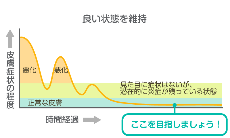 アトピー性皮膚炎は「炎症」「かゆみ」「バリア機能低下」の3つの要素が関係しあい、悪循環を形成すると先ほど述べましたが、デュピクセントを用いた治療では、「見た目には症状はないが、潜在的に炎症が残っている状態」を目指します。